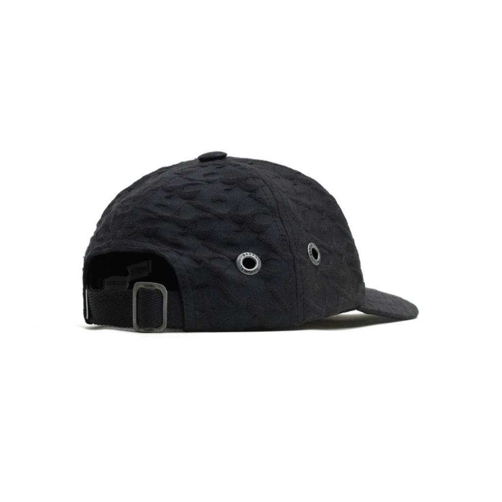 Boné dad hat confeccionado em jacquard de produção exclusiva contendo em relevos do tecido o padrão ‘’Pattern B’’, possui adornos metálicos personalizados. Por BARRA® Jacquard é um tipo de tecido com padrões complexos criados diretamente na tecelagem, utilizando um tear especial que permite o controle individual dos fios. Ao contrário de tecidos estampados ou bordados, os padrões jacquard são tecidos no próprio material, criando desenhos intricados e texturas únicas.