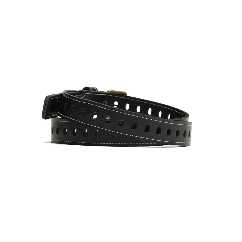 Cinto em couro legítimo com furos por toda a sua extensão. Composto por nossos aviamentos personalizados. Por BARRA®